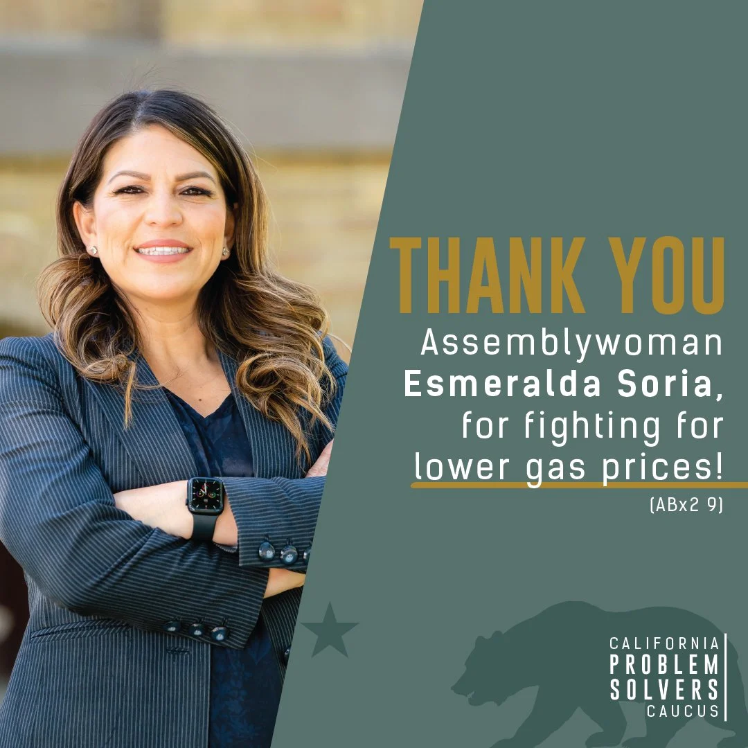 Thank you, Assemblywoman Esmeralda Soria for Fighting to Lower Gas Prices (ABx2 9)and Make Our Communities Safer (SB 268)! Call Assemblywoman Esmeralda Soria and thank her for being a bipartisan problem solver! Call: 916.319.2027